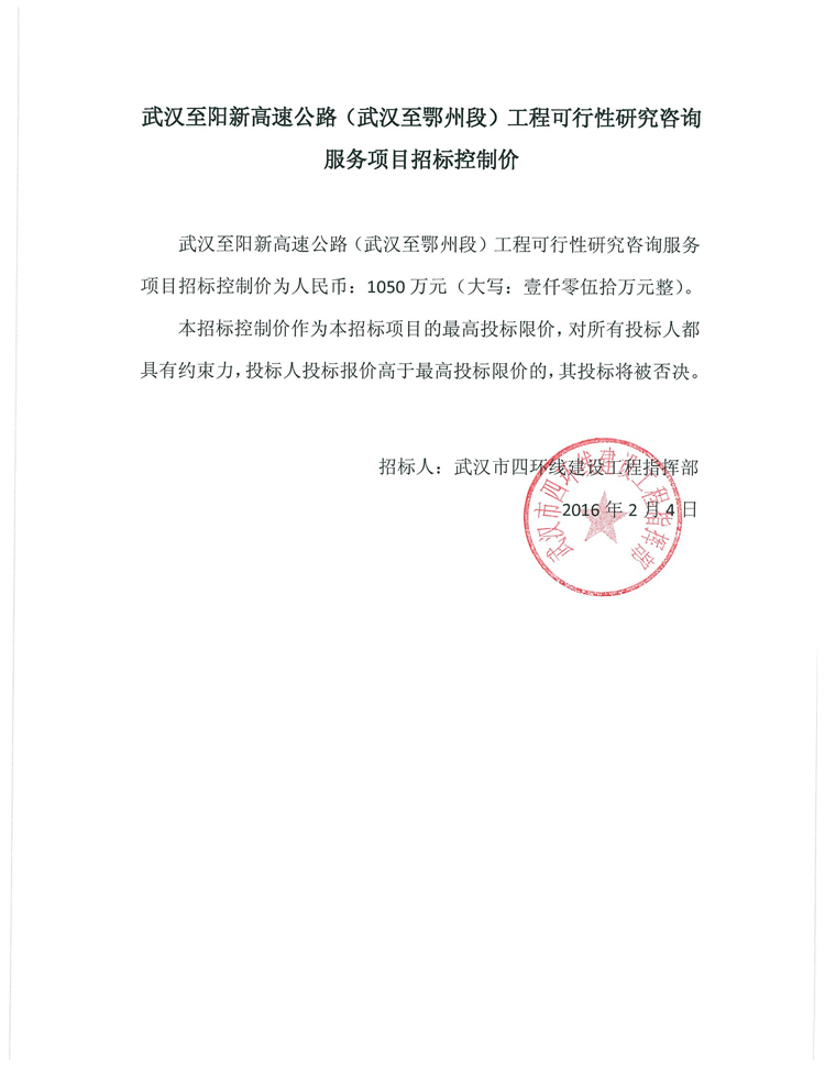 武漢至大悟高速公路工程可行性研究咨詢服務項目招標控制價通知