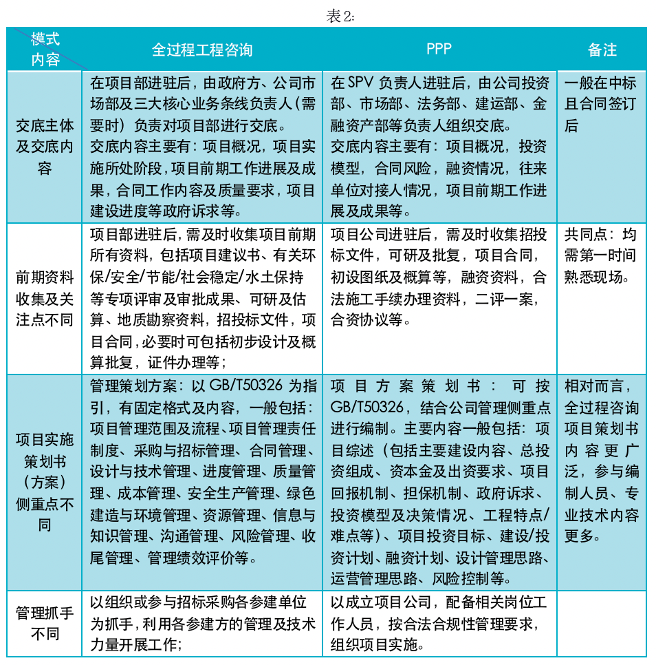 全過程咨詢項(xiàng)目前期管理與PPP項(xiàng)目前期管理因全過程咨詢管理工作更靠前而不盡相同(見表2)