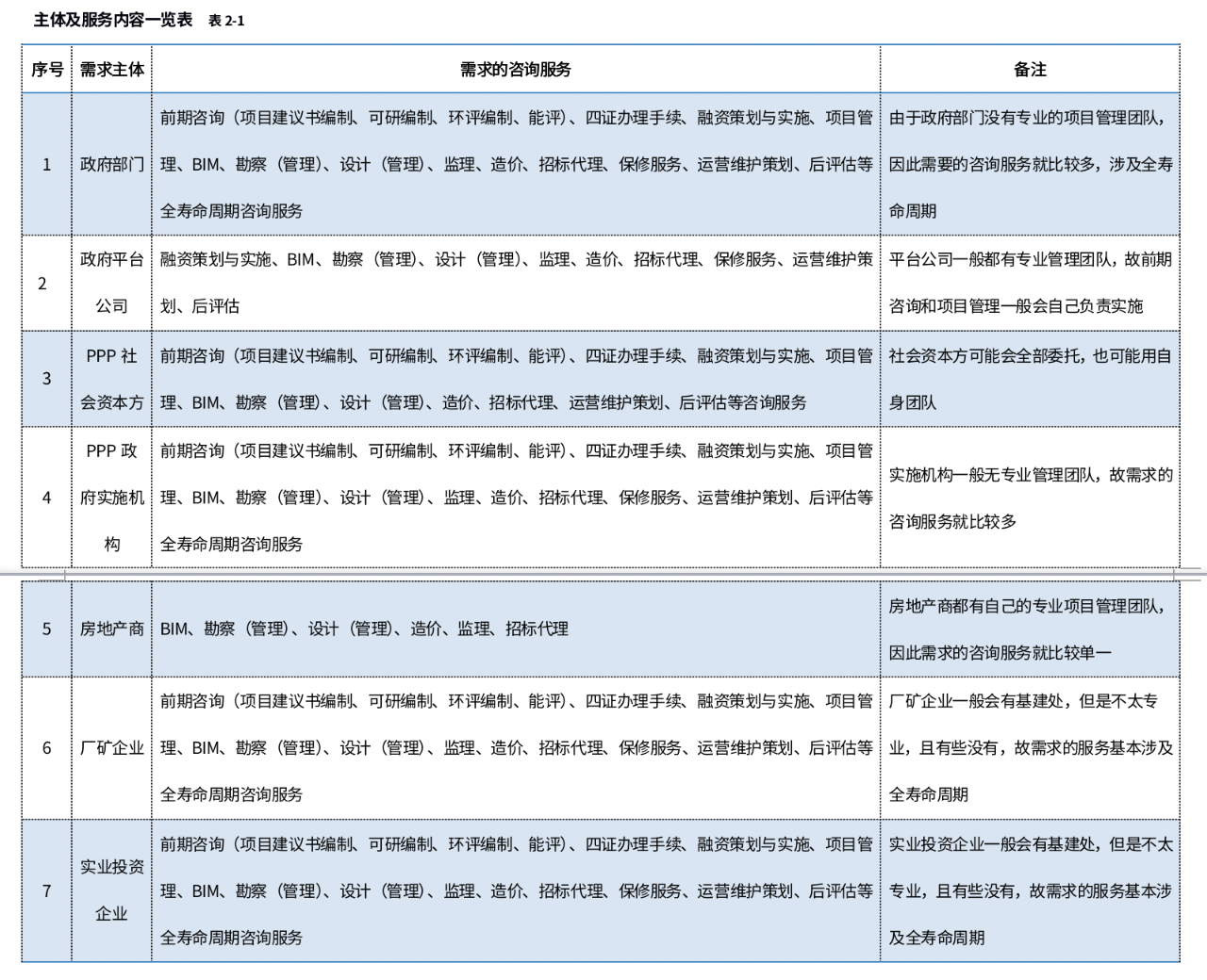不同的投資主體對(duì)全過(guò)程咨詢需求的服務(wù)內(nèi)容是不一樣的,一是因?yàn)橥顿Y主體本身性質(zhì)的不同,法律法規(guī)所規(guī)定的也不一樣,二是投資主體自身團(tuán)隊(duì)管理水平的因素所需求的咨詢服務(wù)也不一樣,以下通過(guò)表格列述不同的主體所需求的咨詢服務(wù):