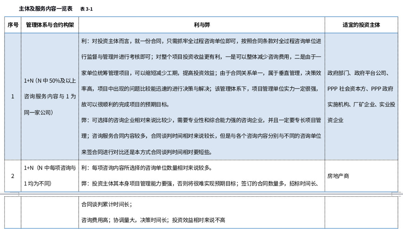 不同的投資主體所需的服務(wù)內(nèi)容和管理模式不一樣,就會(huì)導(dǎo)致項(xiàng)目管理體系上和合約構(gòu)架上不一樣,以下通過(guò)表格闡述不同的管理體系和合約構(gòu)架的利與弊及適宜的投資主體(本文倡導(dǎo)的全過(guò)程咨詢以項(xiàng)目管理為主線,用1表示,前期咨詢、監(jiān)理、造價(jià)、招標(biāo)代理、勘察設(shè)計(jì)管理等用N表示):