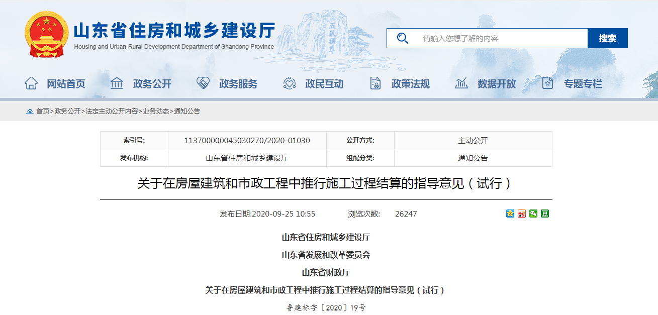 2020年9月17日,山東省住房城鄉(xiāng)建設(shè)廳、省發(fā)展改革委、省財政廳三部門聯(lián)合印發(fā)《關(guān)于在房屋建筑和市政工程中推行施工過程結(jié)算的指導(dǎo)意見(試行)》,通過規(guī)范結(jié)算行為,縮短結(jié)算周期,減輕企業(yè)負(fù)擔(dān):