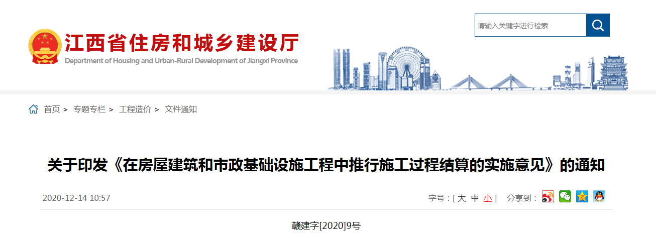2020年12月14日,江西省住建廳發(fā)布通知,印發(fā)《在房屋建筑和市政基礎(chǔ)設(shè)施工程中推行施工過程結(jié)算的實施意見》,自下文之日起施行。