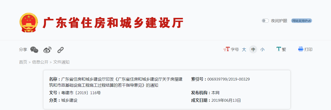 2019年6月13日,廣東省住建廳印發(fā)通知,推進(jìn)全省房屋建筑和市政基礎(chǔ)設(shè)施工程施工過程結(jié)算。