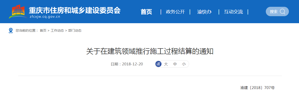 2018年12月20日,重慶市住建委發(fā)布《關(guān)于在建筑領(lǐng)域推行施工過程結(jié)算的通知》,要求:新開工、建設(shè)工期兩年以上工程,推行施工過程結(jié)算。