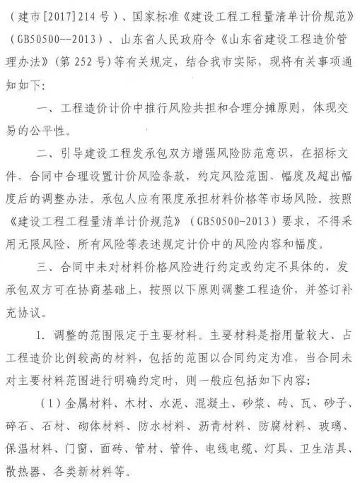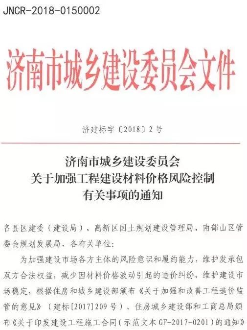 2018年1月30日,濟南市住建委印發(fā)《關于加強工程建設材料價格風險控制有關事項的通知》(濟建標字〔2018〕2號),明確工程計價中應推行風險共擔和合理分攤原則,承包人應有限度承擔材料價格等市場風險。
