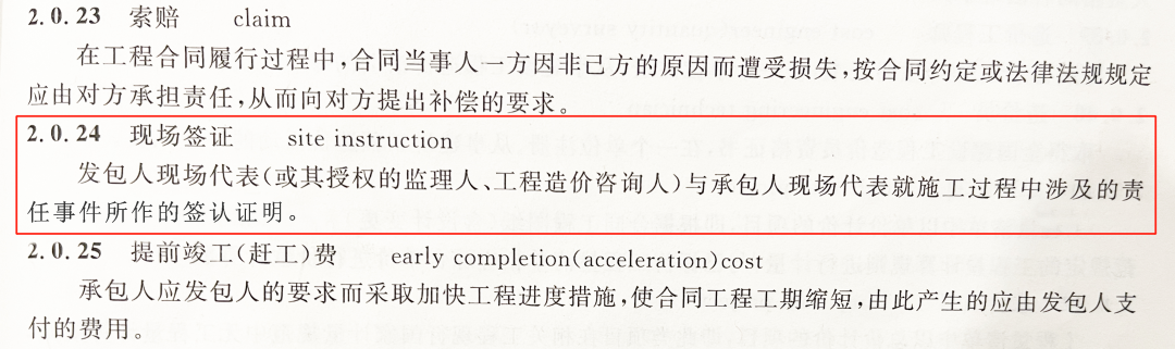 依據(jù)《建設(shè)工程工程量清單計(jì)價(jià)規(guī)范》(GB50500-2013)第2.0.24條對(duì)現(xiàn)場(chǎng)簽證的定義:“發(fā)包人現(xiàn)場(chǎng)代表與承包人現(xiàn)場(chǎng)代表就施工過(guò)程中涉及的責(zé)任事件所作的簽認(rèn)證明。”