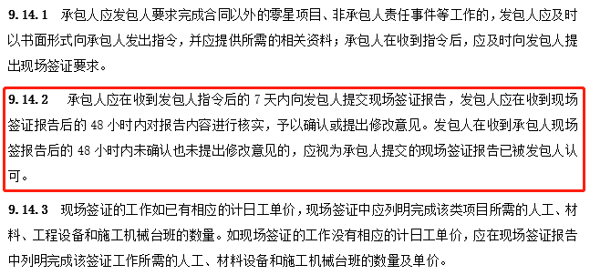 此外,第9.14.2條中,“......發(fā)包人在收到承包人現(xiàn)場(chǎng)簽報(bào)告后的48小時(shí)內(nèi)未確認(rèn)也未提出修改意見(jiàn)的,應(yīng)視為承包人提交的現(xiàn)場(chǎng)簽證報(bào)告已被發(fā)包人認(rèn)可?!?/span>即,從時(shí)限來(lái)講,“48小時(shí)”亦非能夠滿足發(fā)包方充分詢(xún)價(jià)并與承包方定價(jià)的時(shí)長(zhǎng)。