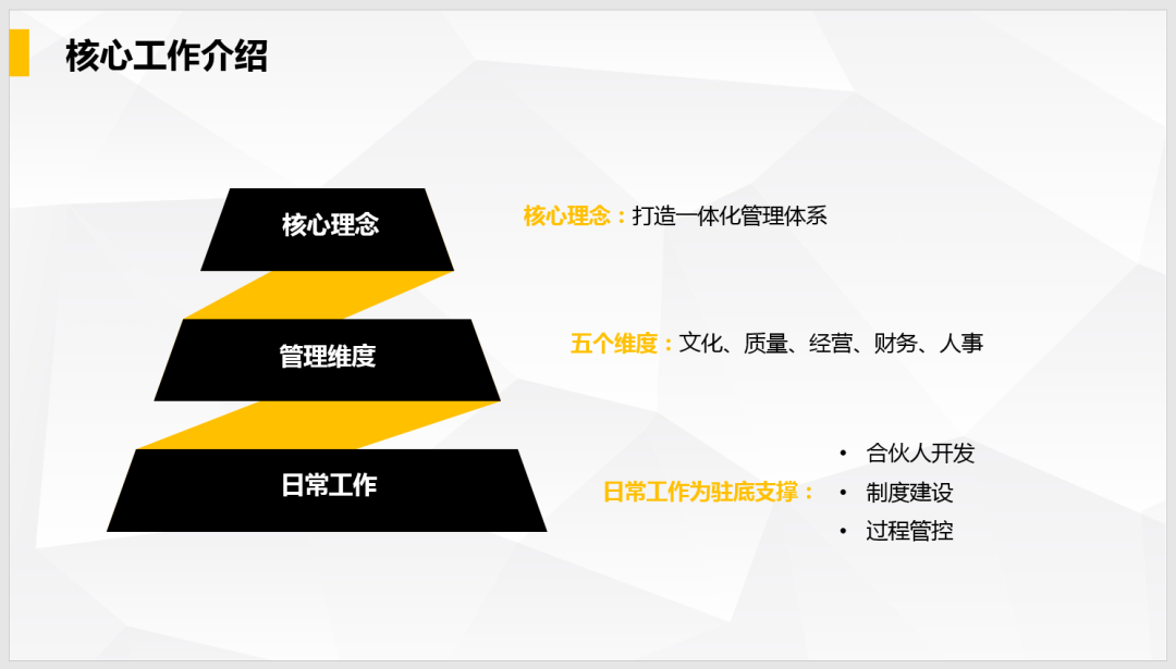 4、合伙人管理部:即將推進(jìn)合伙人風(fēng)控工作組工作,梳理總結(jié),識(shí)別分析,從質(zhì)量成果、檔案用印、財(cái)務(wù)管理、稅務(wù)籌劃等方面入手,加強(qiáng)安全合規(guī)管理。