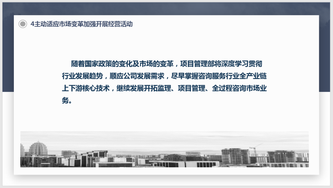 2、項(xiàng)目管理事業(yè)部:及時(shí)總結(jié)已完及在建全過(guò)程工程咨詢項(xiàng)目管理經(jīng)驗(yàn),緊跟公司發(fā)展戰(zhàn)略定位,不斷提高工程咨詢?nèi)a(chǎn)業(yè)鏈上下游核心技術(shù)水平,積極發(fā)展開拓工程監(jiān)理、項(xiàng)目管理、全過(guò)程工程咨詢業(yè)務(wù)。