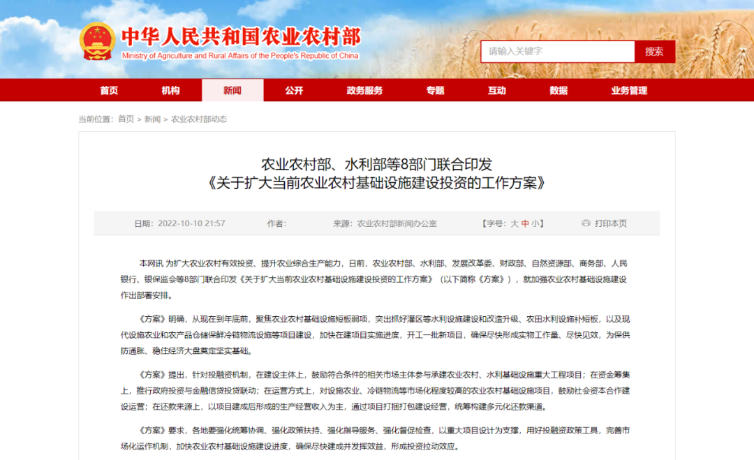 八大部門聯(lián)合印發(fā):《關(guān)于擴(kuò)大當(dāng)前農(nóng)業(yè)農(nóng)村基礎(chǔ)設(shè)施建設(shè)投資的工作方案》