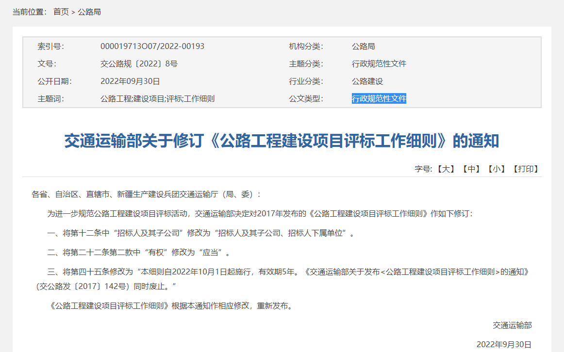 為進一步規(guī)范公路工程建設(shè)項目評標(biāo)工作活動,結(jié)合2017年發(fā)布的《公路工程建設(shè)項目評標(biāo)工作細則》執(zhí)行情況,并與近期發(fā)布的有關(guān)文件規(guī)定保持一致,對原細則個別條款進行了修訂。主要內(nèi)容:一是將第十二條中“招標(biāo)人及其子公司”修改為“招標(biāo)人及其子公司、招標(biāo)人下屬單位”。二是將第二十二條第二款中“有權(quán)”修改為“應(yīng)當(dāng)”。三是將第四十五條修改為:“本細則自2022年10月1日起施行,有效期5年。《交通運輸部關(guān)于發(fā)布<公路工程建設(shè)項目評標(biāo)工作細則的通知>》(交公路發(fā)〔2017〕142號)同時廢止?!?/span>