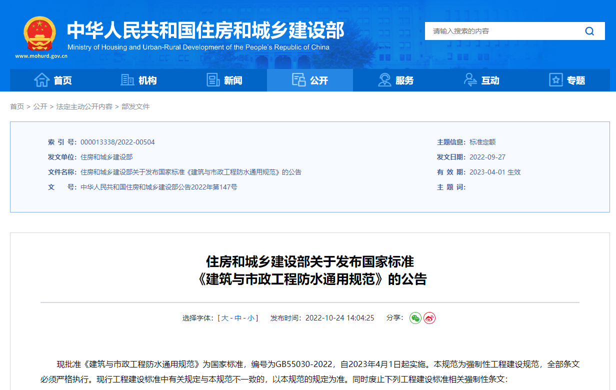 10月24日,住建部發(fā)布國家標(biāo)準(zhǔn)《建筑與市政工程防水通用規(guī)范》的公告。現(xiàn)批準(zhǔn)《建筑與市政工程防水通用規(guī)范》為國家標(biāo)準(zhǔn),編號為GB55030-2022,自2023年4月1日起實施。本規(guī)范為強制性工程建設(shè)規(guī)范,全部條文必須嚴(yán)格執(zhí)行?,F(xiàn)行工程建設(shè)標(biāo)準(zhǔn)中有關(guān)規(guī)定與本規(guī)范不一致的,以本規(guī)范的規(guī)定為準(zhǔn)。