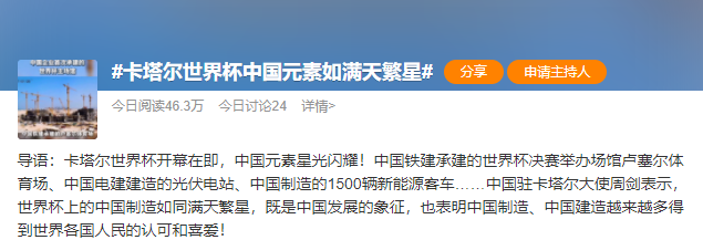 11月20日,2022年卡塔爾世界杯正式開幕。開幕式當天,中國外交部發(fā)言人華春瑩在推特上連發(fā)8條推文,以圖文并茂的方式介紹世界杯“隨處可見的中國元素”。這也讓“卡塔爾世界杯中國元素如滿天繁星”的話題登上熱搜。