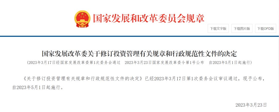《關(guān)于修訂投資管理有關(guān)規(guī)章和行政規(guī)范性文件的決定》已經(jīng)2023年3月17日第1次委務(wù)會議審議通過,現(xiàn)予公布,自2023年5月1日起施行。