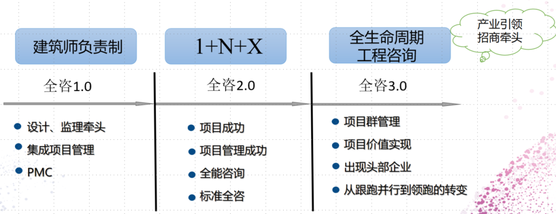 在總書記全生命周期管理思想的指導下,中國的“全咨”已經(jīng)由“全過程工程咨詢”過渡到“全生命周期工程咨詢”,進入了全咨3.0時代。全咨3.0要點是全咨邊界向前擴展到“招商引資”,向后延伸至“運營維護”。