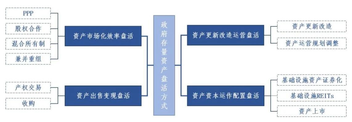存量資產(chǎn)盤(pán)活償還是指采取各種方式來(lái)整合資產(chǎn)并且利用好現(xiàn)有的資產(chǎn),實(shí)現(xiàn)國(guó)有資產(chǎn)保值增值,利用回收資金償還政府隱性債務(wù)?;趪?guó)家政策文件,以及實(shí)踐經(jīng)驗(yàn),政府存量資產(chǎn)盤(pán)活方式總結(jié)為以下四大方式: