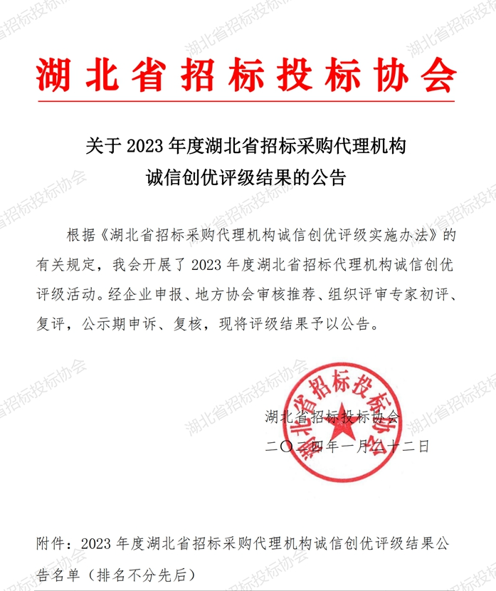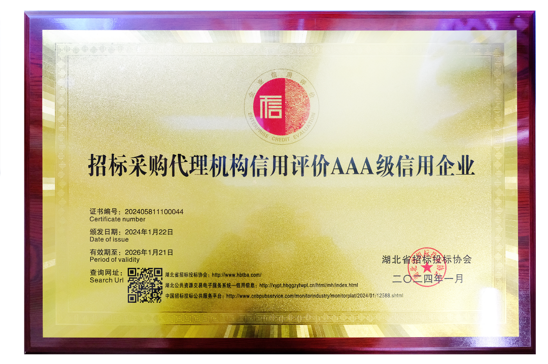 近日,鼎正憑借誠信的經(jīng)營理念、良好的企業(yè)信譽和優(yōu)質(zhì)的服務質(zhì)量,榮獲由湖北省招標投標協(xié)會認定的最高等級“招標采購代理機構信用評價AAA級信用企業(yè)”稱號。