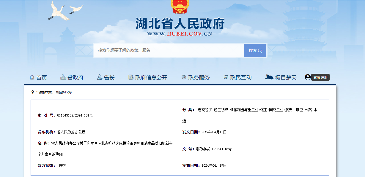 《湖北省推動大規(guī)模設(shè)備更新和消費品以舊換新實施方案》已經(jīng)省人民政府同意,現(xiàn)印發(fā)給你們,請認真貫徹落實。2024年4月11日