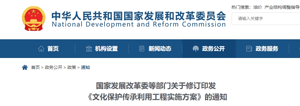 日前,國家發(fā)展改革委會同住房城鄉(xiāng)建設部、中央宣傳部、文化和旅游部等部門對《文化保護傳承利用工程實施方案》進行了修訂。