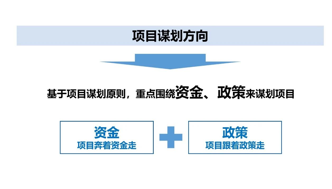 如果我們還是按照以前做項(xiàng)目的邏輯,那是很難獲得項(xiàng)目的資金支持。新形勢下,項(xiàng)目謀劃應(yīng)該謀什么?彭總提出兩大項(xiàng)目謀劃方向,即項(xiàng)目奔著資金走和項(xiàng)目跟著政策走。