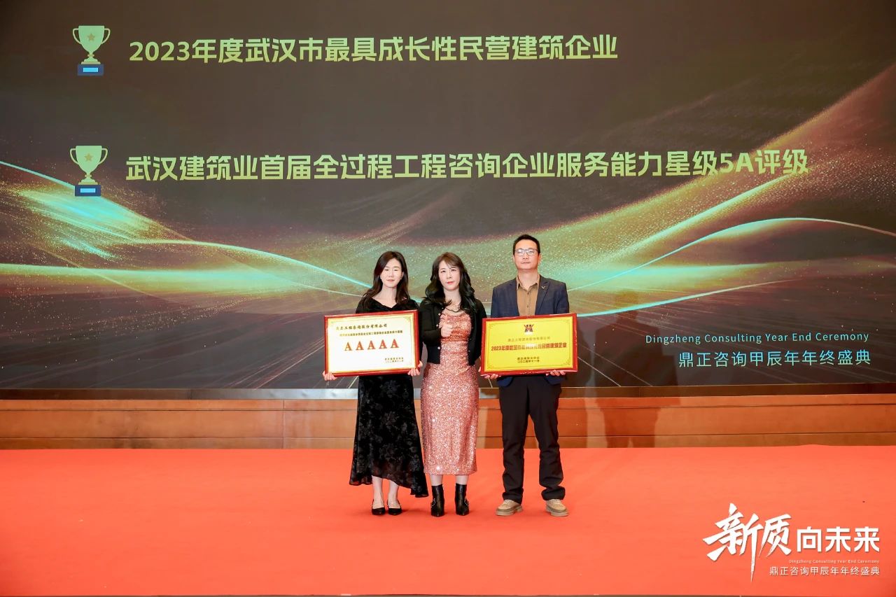 在過去的一年里,鼎正在專家輔助人、專項債、超長期特別國債、中央預算內資金、全過程工程咨詢等業(yè)務板塊中,展現(xiàn)出強勁的創(chuàng)新力,并獲得行業(yè)廣泛的認可。當晚,武漢建筑業(yè)協(xié)會領導代表、全咨分會秘書長陳金琳女士,為我們頒發(fā)了2023年度武漢市最具成長性民營建筑企業(yè)、武漢建筑業(yè)首屆全過程工程咨詢企業(yè)服務能力星級5A評級兩項榮譽。