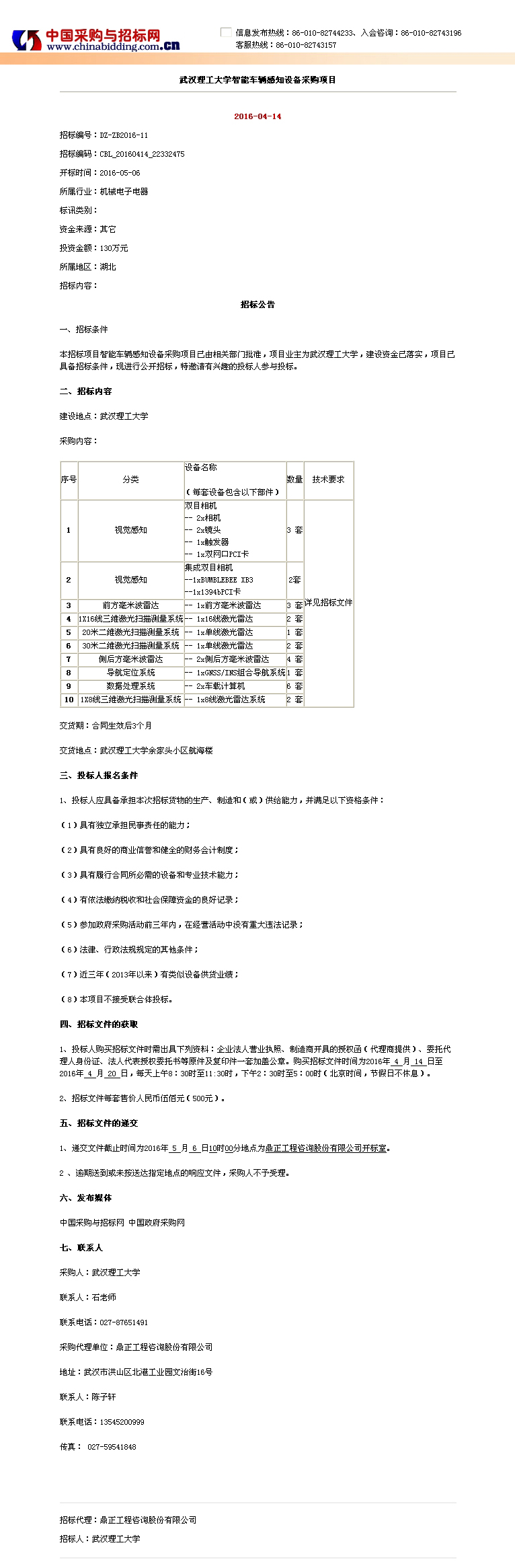 武漢理工大學(xué)智能車(chē)輛感知設(shè)備采購(gòu)項(xiàng)目招標(biāo)公告