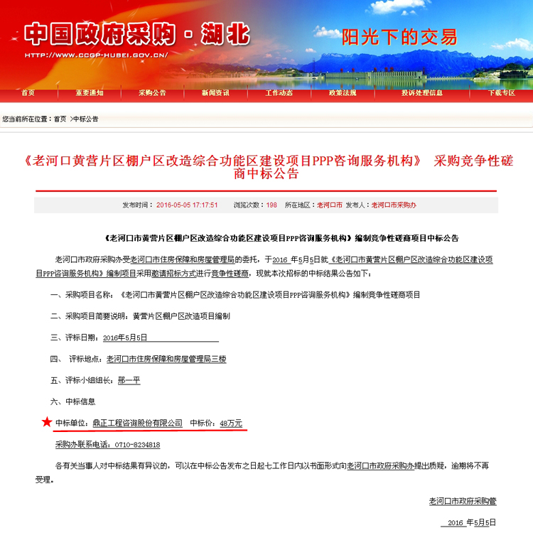 【經(jīng)營(yíng)成果】我司中標(biāo)老河口市黃營(yíng)片區(qū)棚戶區(qū)改造綜合功能區(qū)建設(shè)項(xiàng)目PPP咨詢服務(wù)機(jī)構(gòu)編制競(jìng)爭(zhēng)性磋商項(xiàng)目