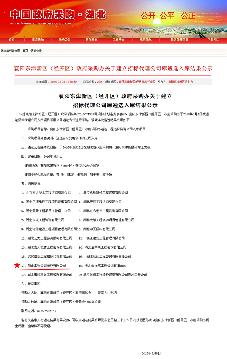 【經(jīng)營成果】我司入圍襄陽東津新區(qū)(經(jīng)開區(qū))政府采購辦招標代理公司庫
