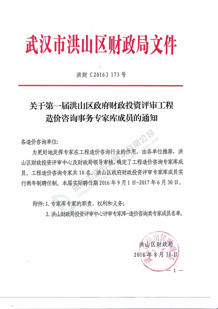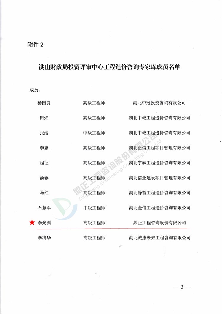 我司李光洲同志被武漢市洪山區(qū)財(cái)政局特聘為洪山區(qū)政府財(cái)政投資評(píng)審(工程造價(jià)咨詢事務(wù))專家