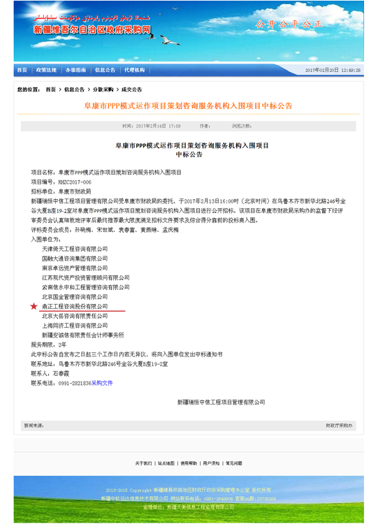 近日,新疆維吾爾自治區(qū)采購網(wǎng)公布了阜康市PPP模式運作項目策劃咨詢服務機構入圍項目中標公告,我司成功入圍。