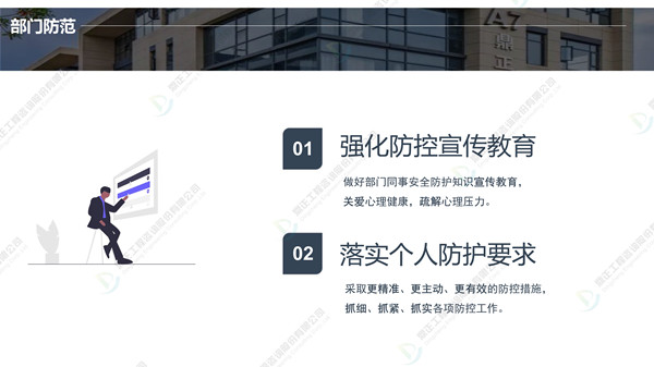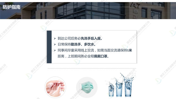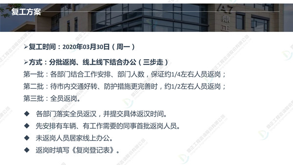 分批返崗、線上線下結(jié)合辦公,鼎正人的復(fù)工準(zhǔn)備工作正有序進(jìn)行。在疫情防控、復(fù)工復(fù)產(chǎn)兩手抓的同時(shí),鼎正咨詢(xún)將一如既往地為客戶提供專(zhuān)業(yè)的全過(guò)程工程咨詢(xún)服務(wù)。