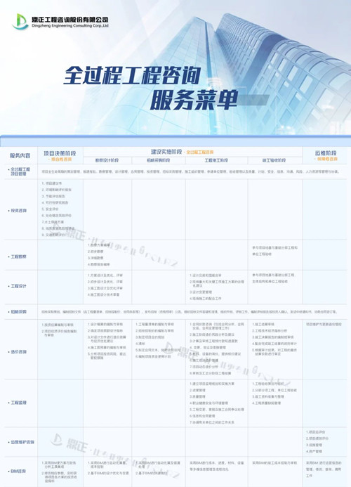 鼎正咨詢資質(zhì)資信及業(yè)務(wù)能力已覆蓋工程咨詢?nèi)a(chǎn)業(yè)鏈,可提供全過程工程咨詢、PPP全生命周期咨詢、項目策劃、工程投資咨詢 、土地利用規(guī)劃、城鄉(xiāng)規(guī)劃、工程設(shè)計、工程監(jiān)理、招標代理、政府采購、工程造價咨詢、BIM咨詢等服務(wù)。
